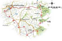 11 Turn left at Bridleway junction; follow marked track 1 mile, through wood and up hill beyond, to Harcourt crossroads; straight ahead for 1 mile along lane to ‘T’ junction at edge of Stottesdon; turn left; follow road passed School and round to village centre; Fighting Cocks on left.
